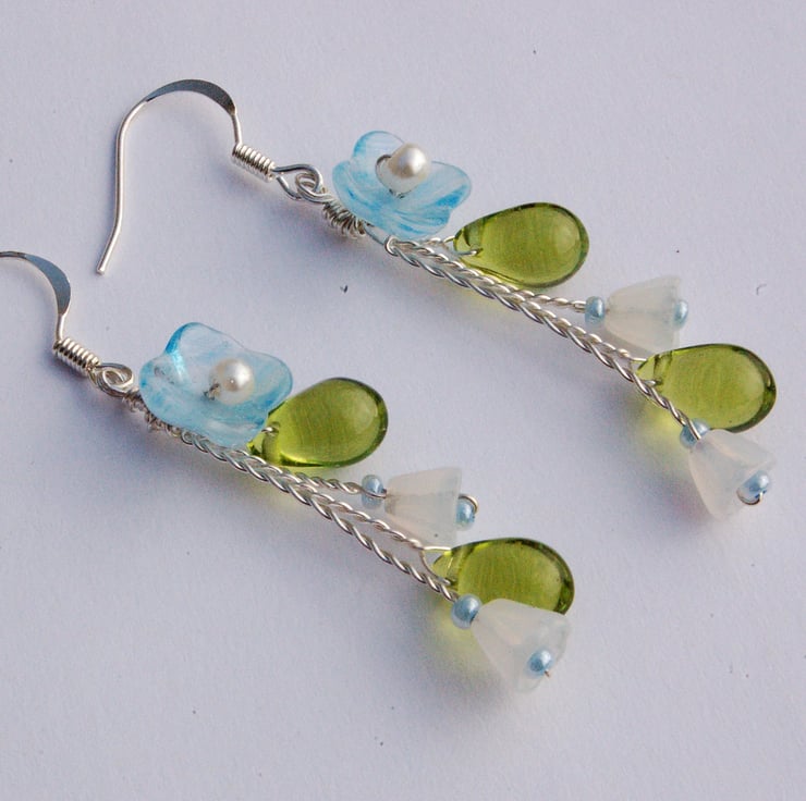 Glass flowers and leaves and some tiny seed beads make up this pair of earrings in uplifting spring like colours.
