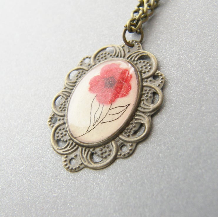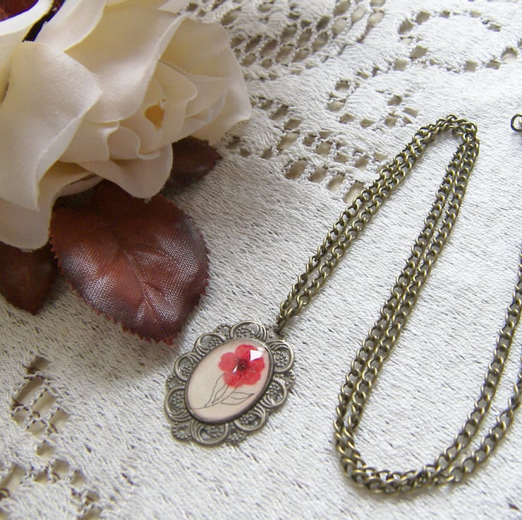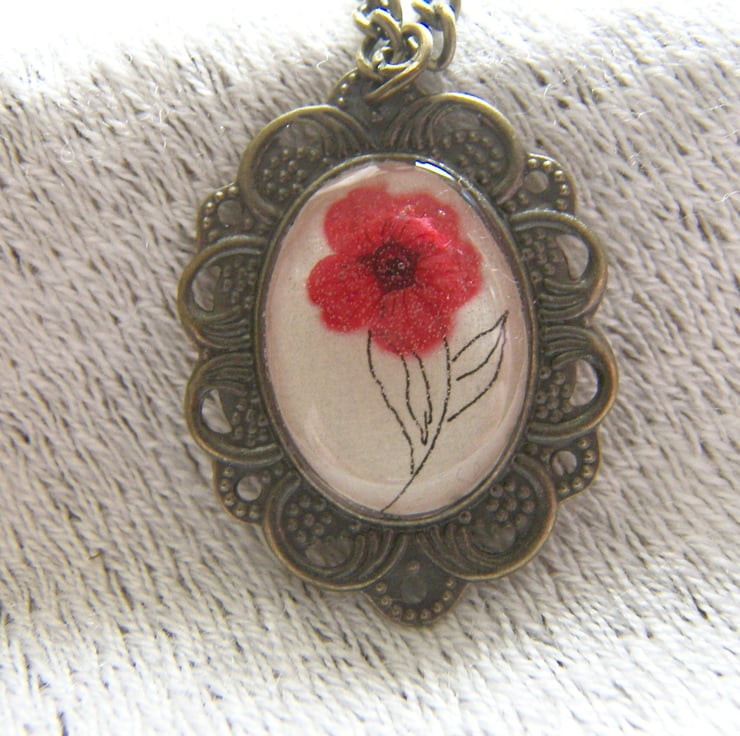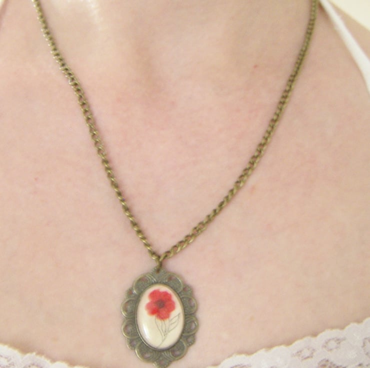 Description: I very carefully treated this lovely real flower head to retain lovely colour. I have hand drawn the stems, and applied real miniature poppy head before sealing in non toxic uv resistant resin, on a bronze vintage style cameo base measures approx 30mm x 23mm (just over 1" x .75") hangs on 18" antique bronze plated chain. (I love poppies, such a pretty dainty necklace)