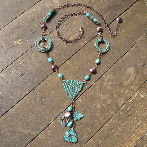 This necklace is made of various handmade pieces, plastic beads and semi-precious stones. The chain and the connectors are copper. It's about 74cm (29 inches) long.