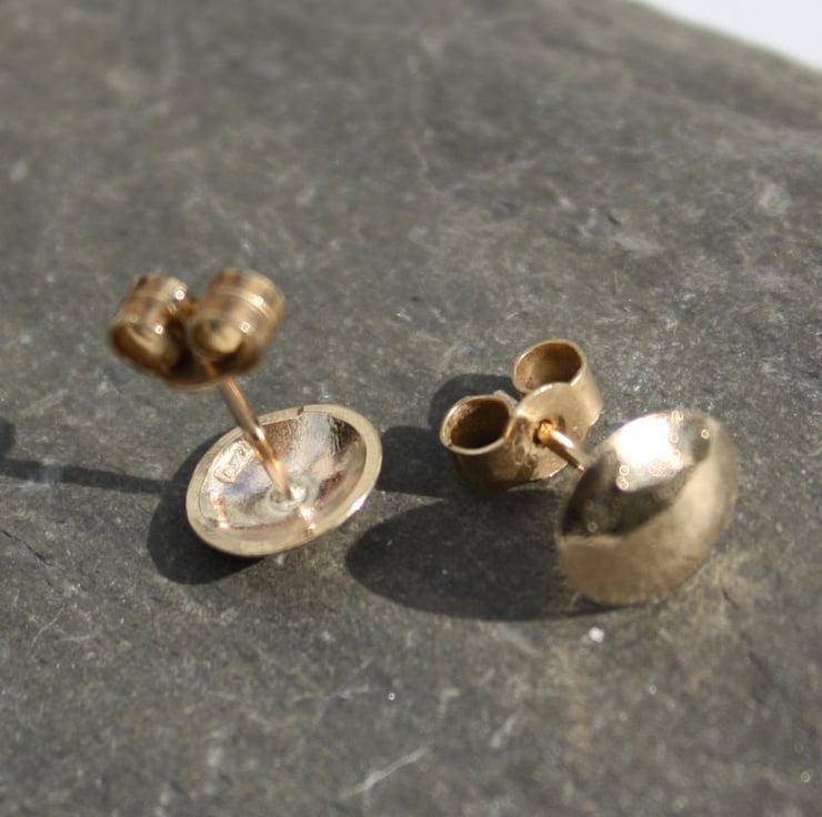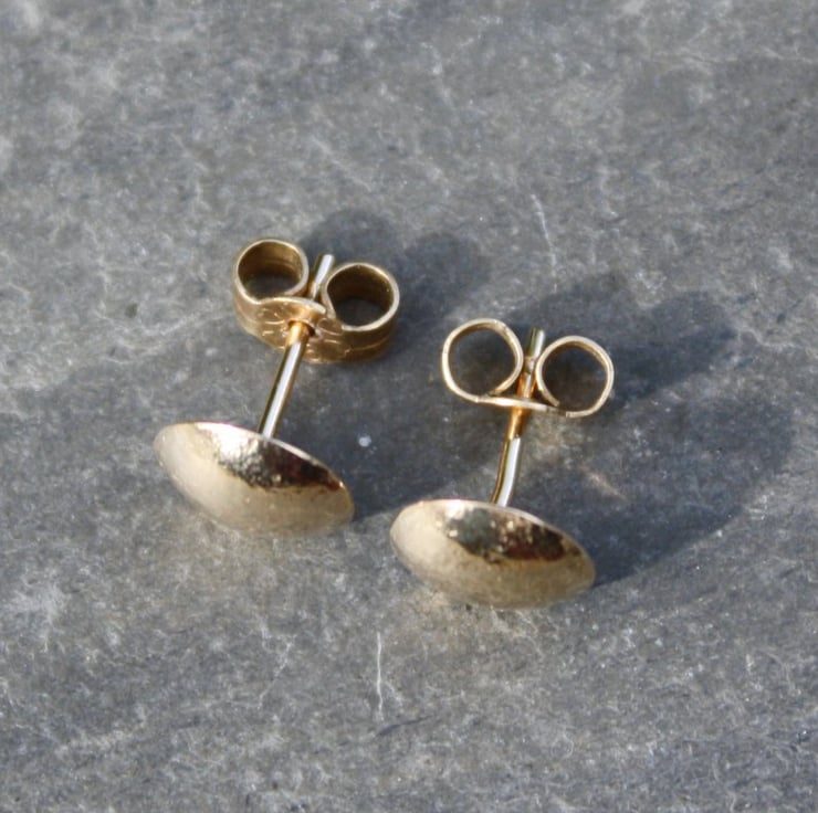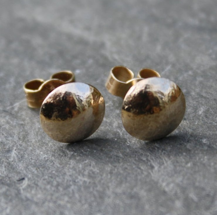 These simple little 8mm diameter circular studs have a hammered textured finish, and are polished to a bright shine.