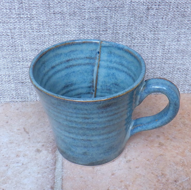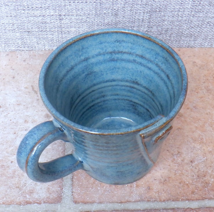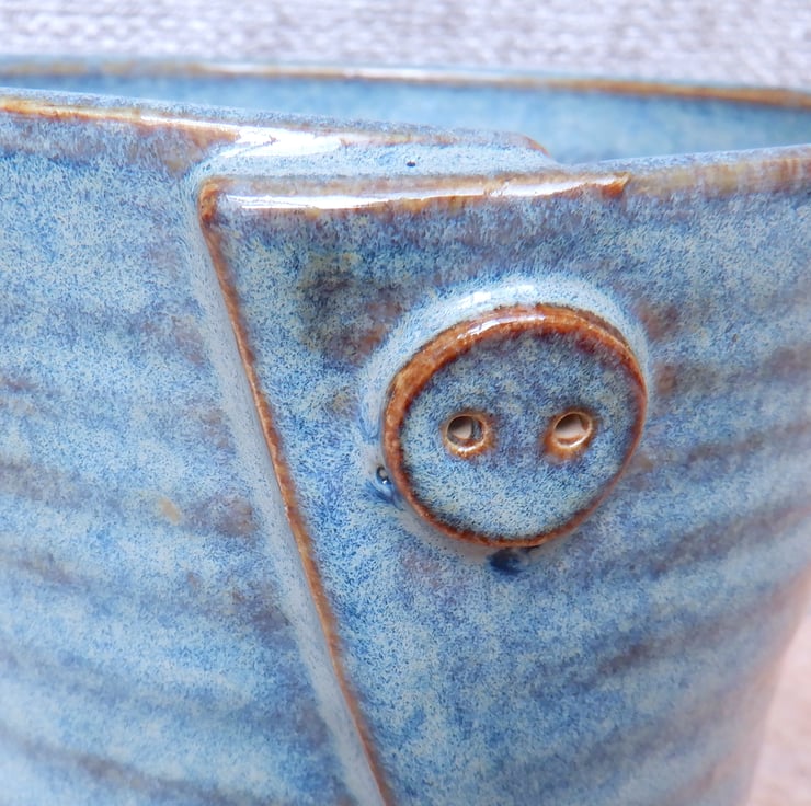 I threw this large capacity mug on my pottery wheel using strong white stoneware clay, cut the side and reshaped it, then added a little button detail.