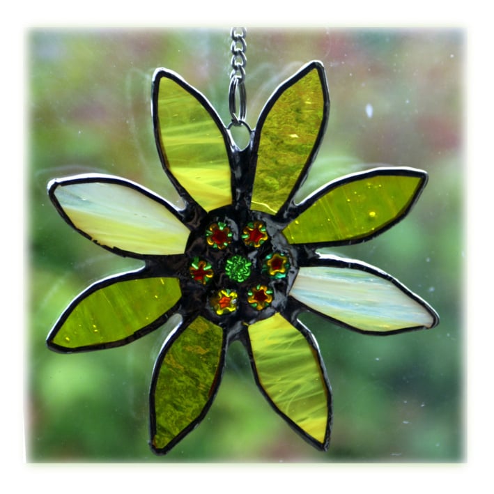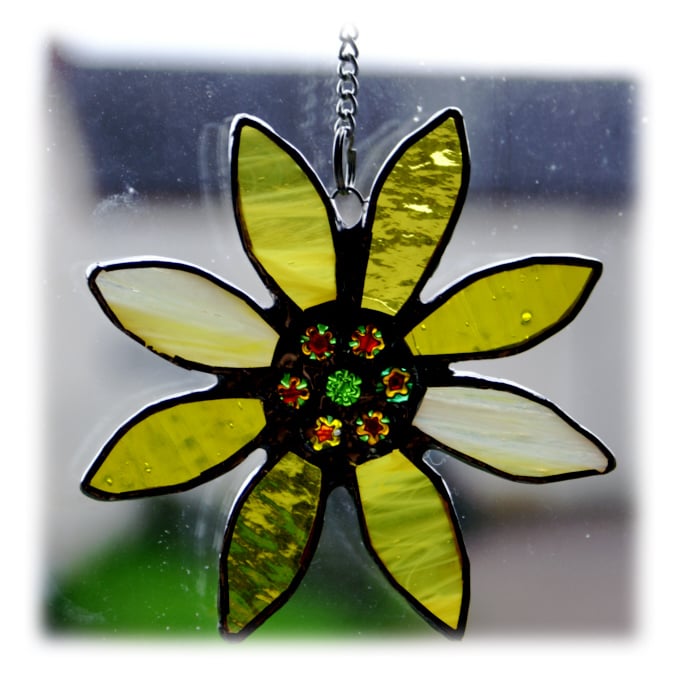 It is a gorgeous bright yellow sunflower with 8 petals made from 4 different shades and textures of lovely steaky and textured sunshine yellow glass. At the centre are 7 pretty little millefiori beads.