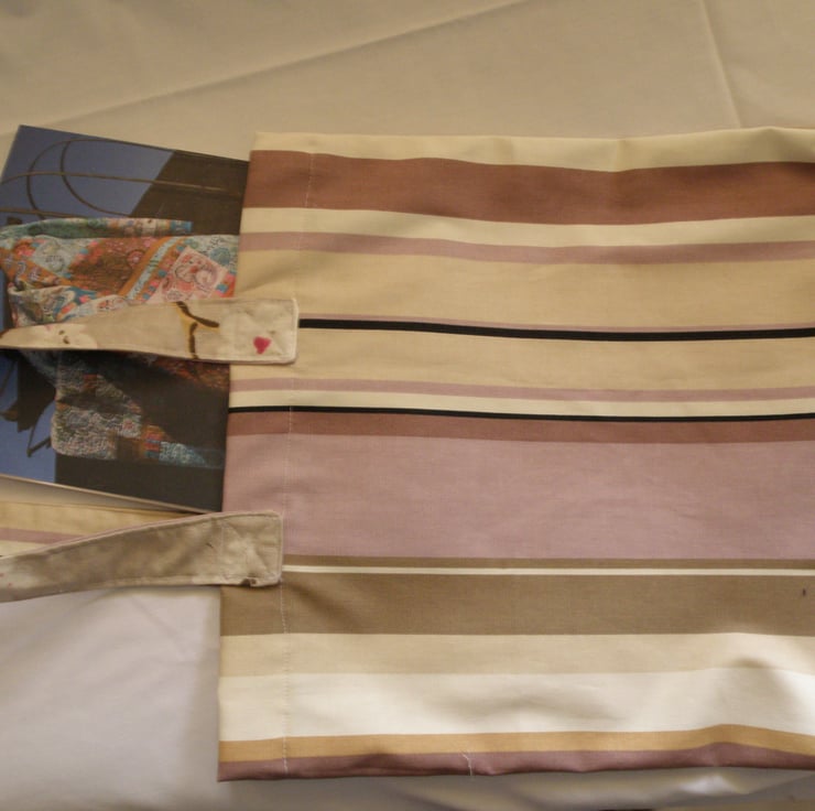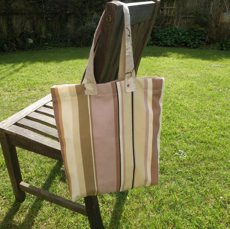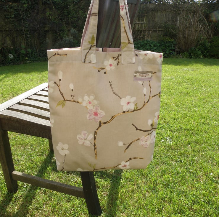This lovely bag screams of spring with its lovely cherry blossom print front and has a fabulous stripy back in coordinating colours of mauves, coffee and cream . The handles measure approx. 20 inches long and the bag measures overall approx. 17 inches by 14.5 inches . So theres plenty of room for your magazine, lunch and other bits an bobs you need to carry around!