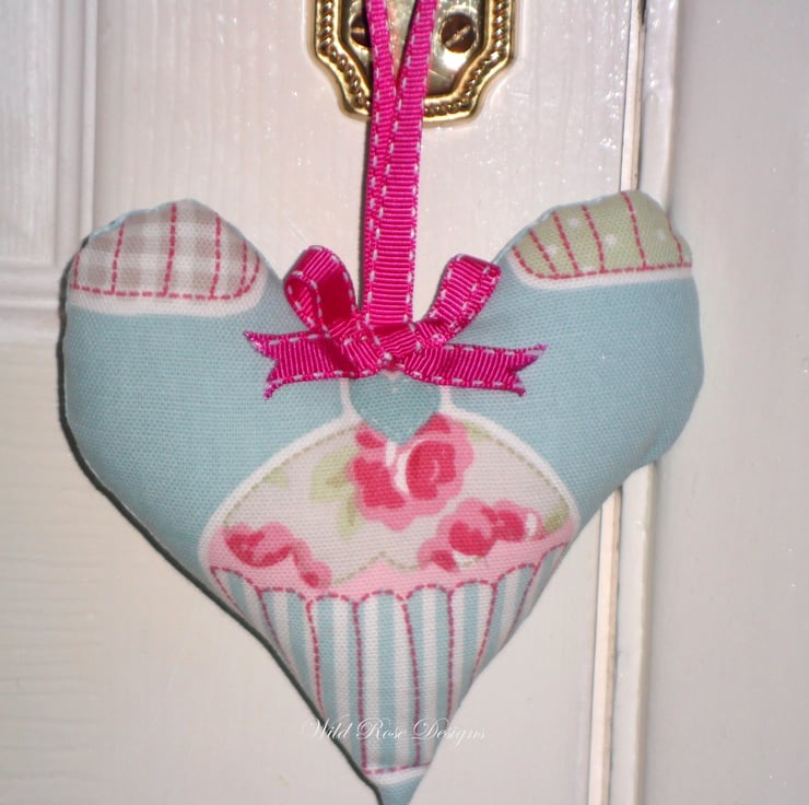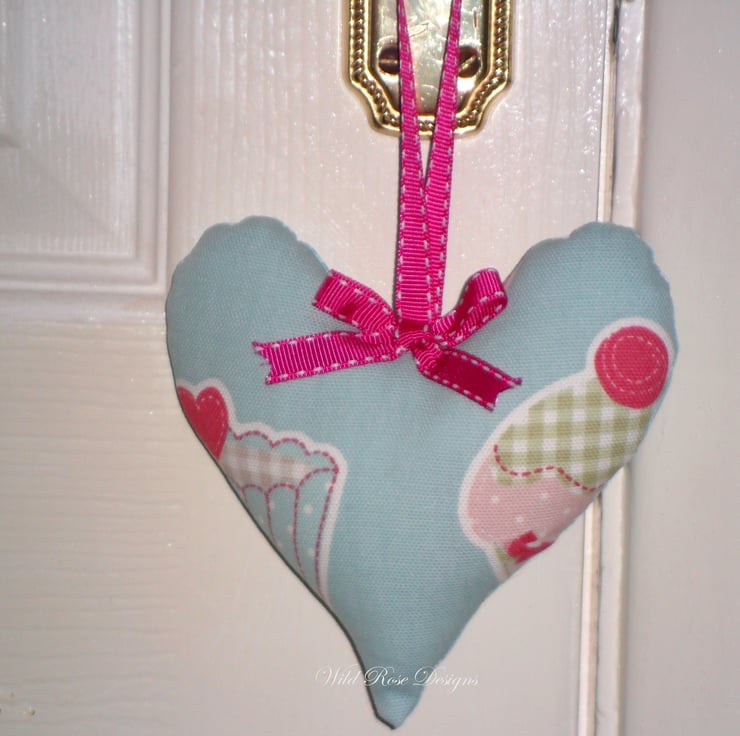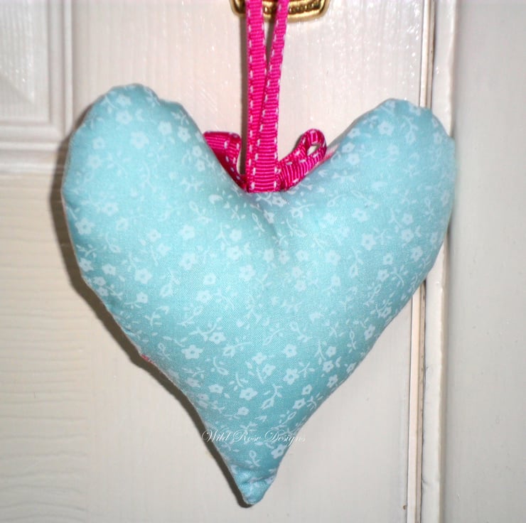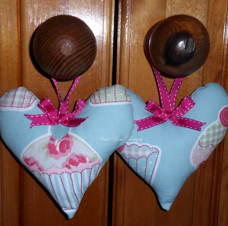 A pair of pretty Lavender Scented Hearts made in a duck egg blue cupcake cotton print fabric. The heart is finished with a pink gross grain hanging loop and bow and the reverse fabric is a duck egg blue cotton print. The heart is filled with polyester and encloses a small circle of felt infused with Pure Essential Lavender Oil.