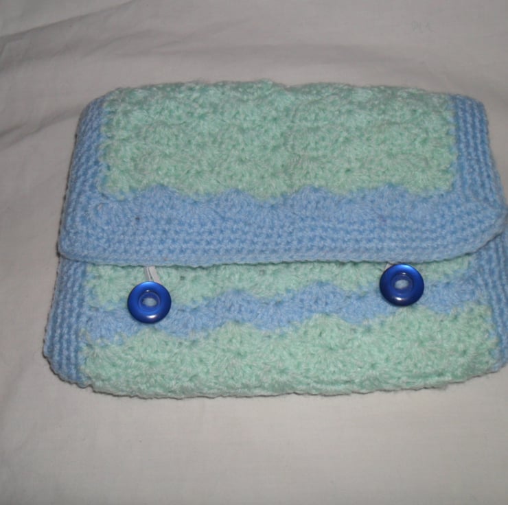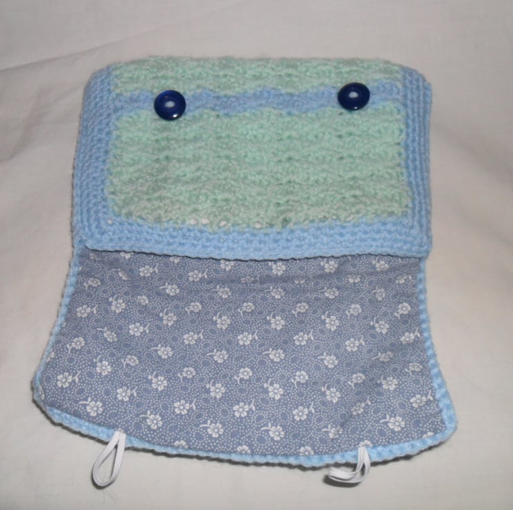 I have crocheted this case in a pretty shell pattern. It is also lightly padded and is lined in a pretty blue and white floral cotton pint material.