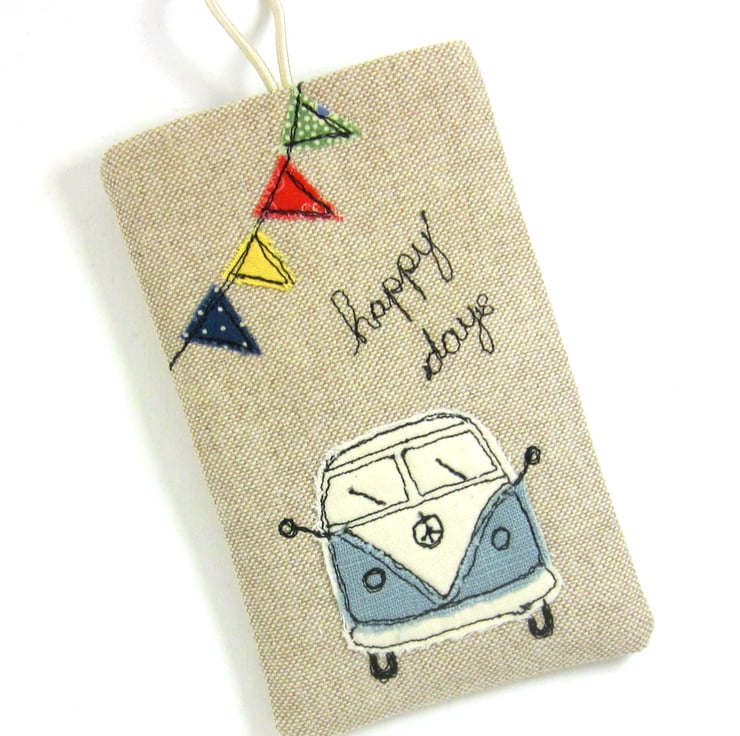 - Made from a linen-cotton blend fabric with an applique retro camper van in duck egg blue, and colourful bunting detail to the front
