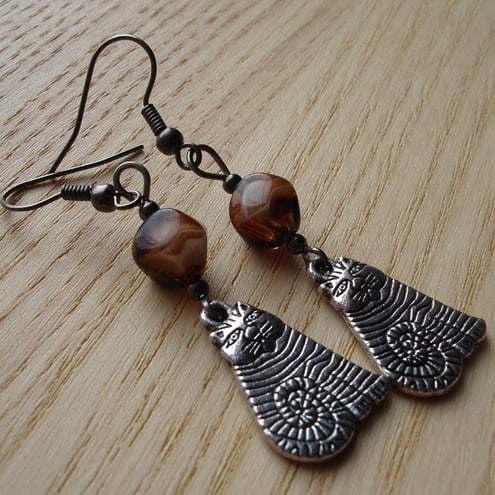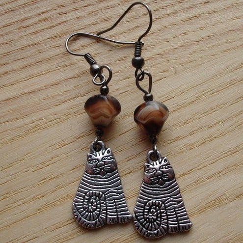 These lovely earrings feature a pair of really sweet stripey tibetan silver kitty cats - purrrrrfect for any cat lovers out there. They hang on black wires with a marbled brown czech glass bead above them. Light enough for regular wear, they make great daytime earrings.
