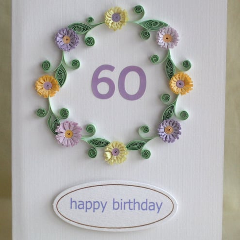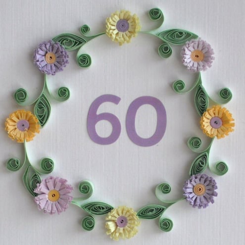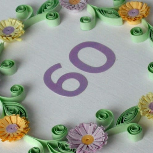 A beautiful handmade quilled 60th birthday card with quilling flowers in lilac and lemon, for a very special person. Perfect for helping that someone special celebrate a birthday.