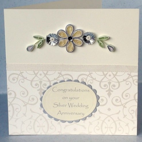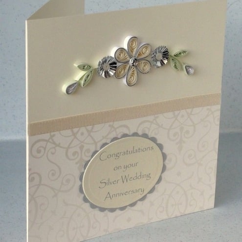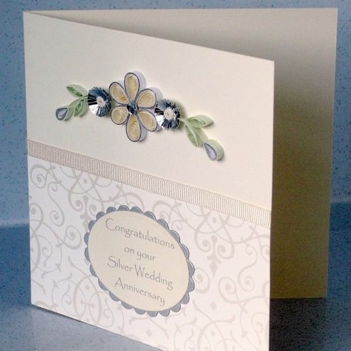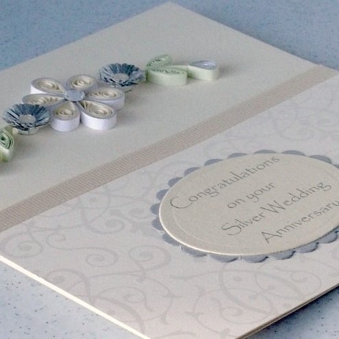 A beautiful quilled silver anniversary congratulations card with quilling flowers in ivory and silver. A very original handmade card to celebrate a 25th anniversary.