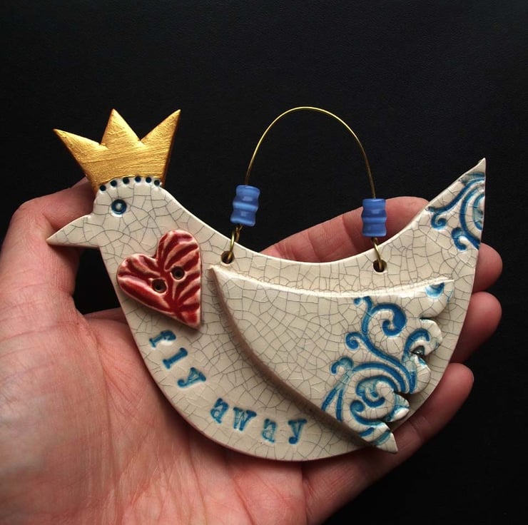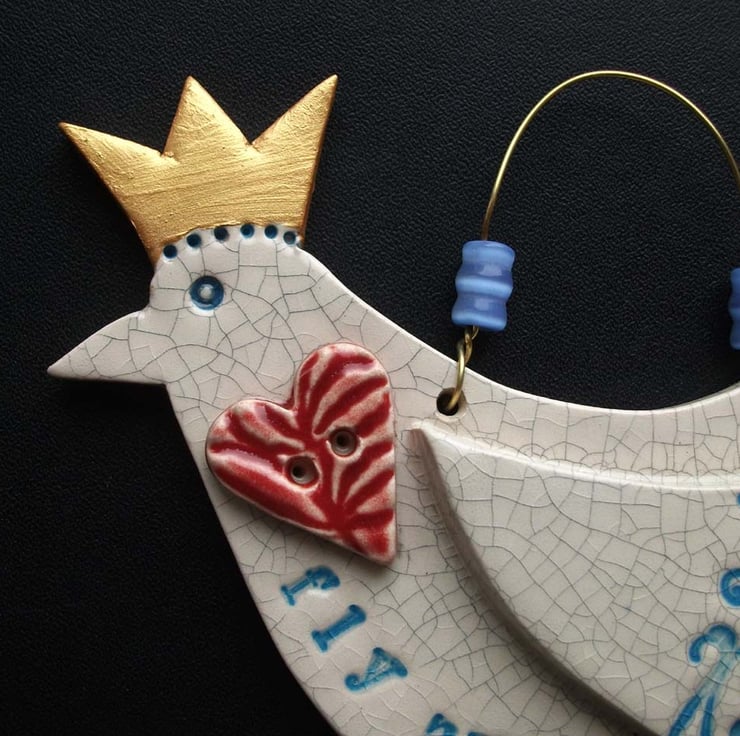 This bird decoration is hand cut from white earthenware clay and decorated with an embossed swirl. It is then twice fired to a top temperature of 1100 degrees so it is nice and strong.