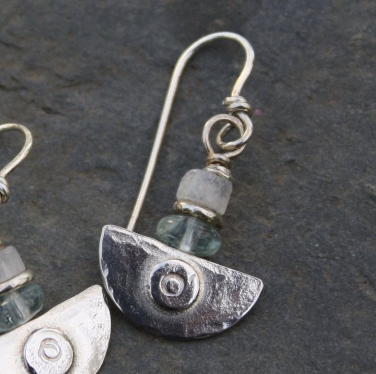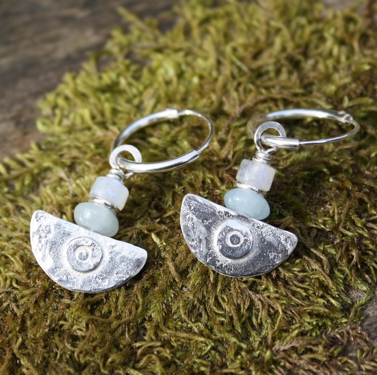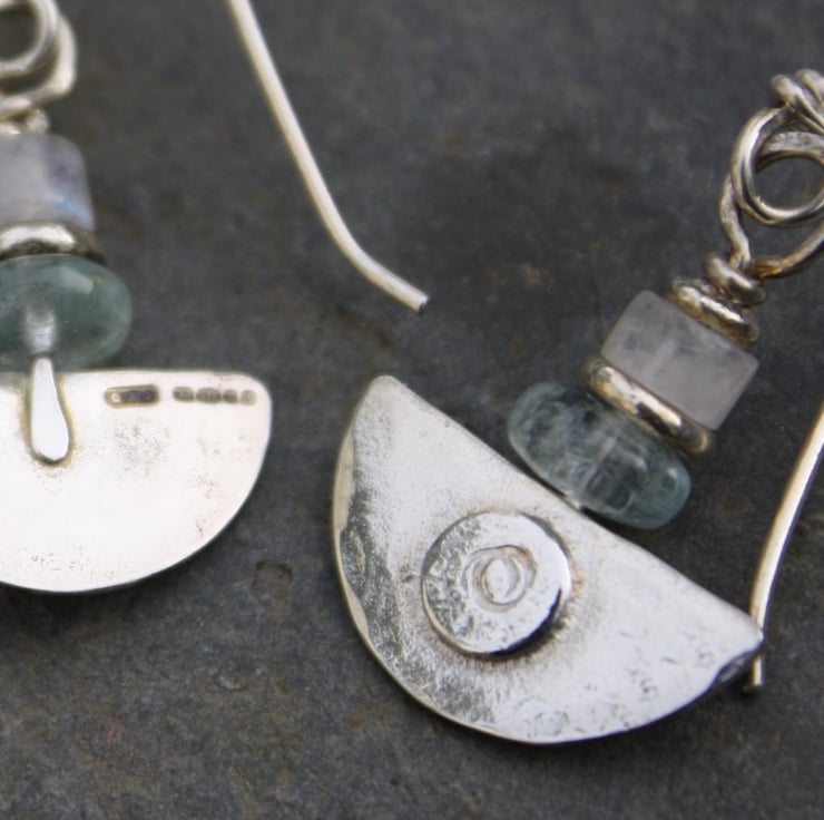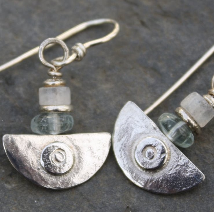 Sterling silver , moonstone and aquamarine earrings. Fused and hammered for texture, then burnished to a subtle shine.