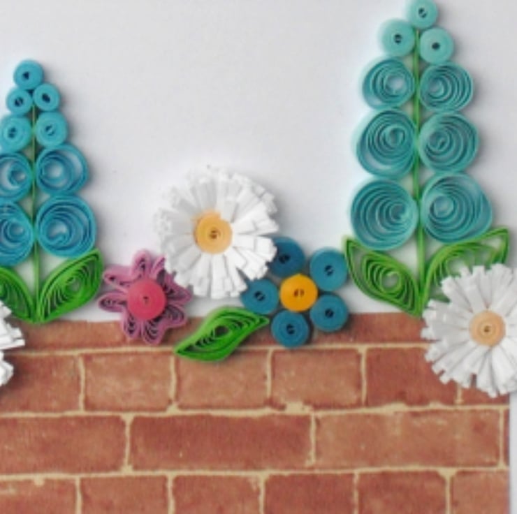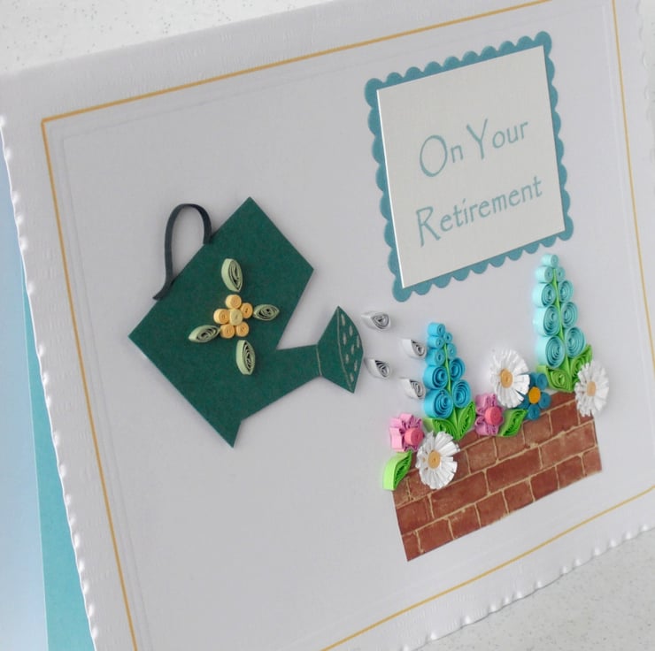 Perfect for sending good wishes on retirement to anyone who is going to enjoy having more time to spend gardening. A die cut watering can with a bed of mixed blooms, all handmade quilled flowers.