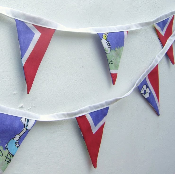 Up-cycled from a discarded duvet cover this fabric has been transformed into fun bunting instead of going to landfill, making this an eco-friendly gift for those who are enviromentally aware.