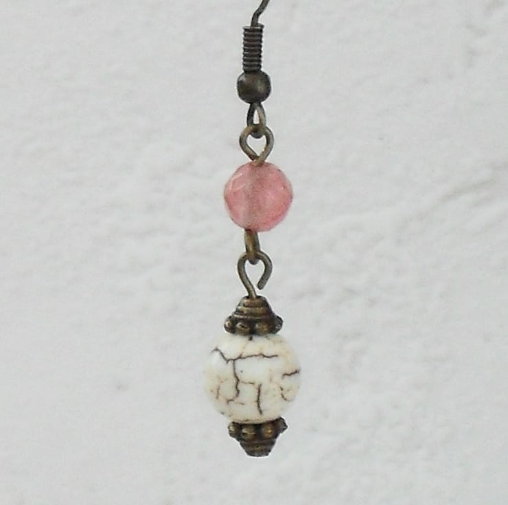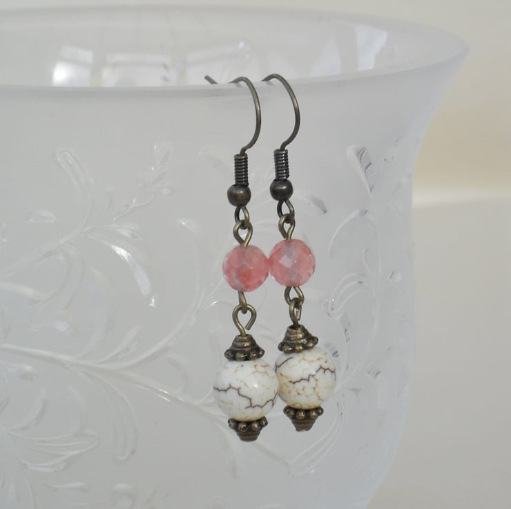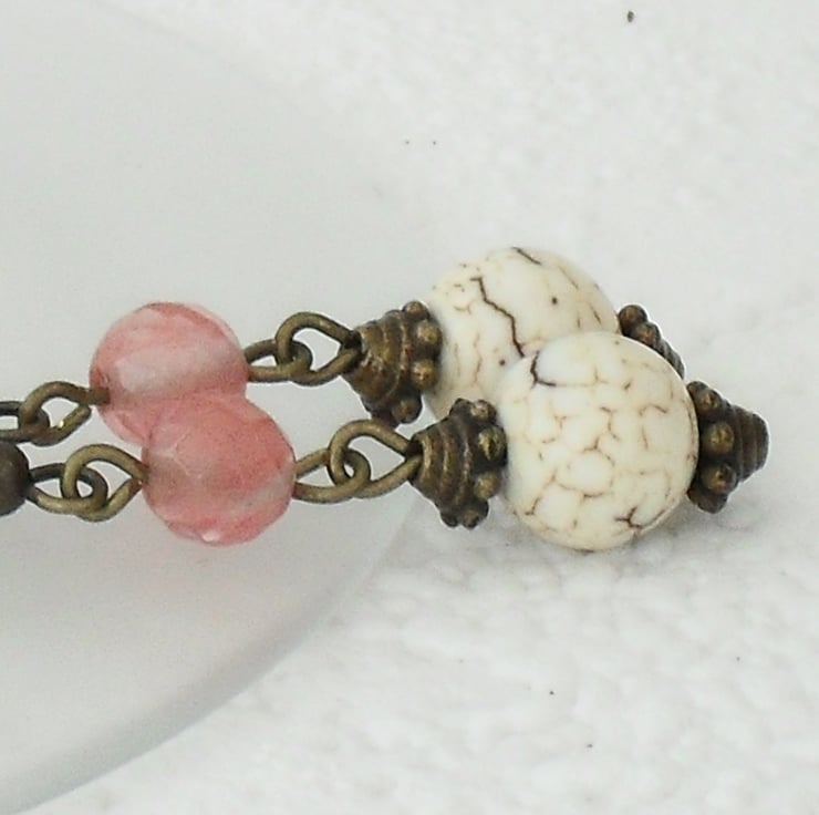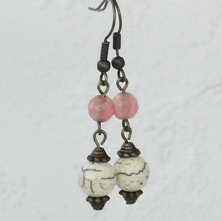 The delicate peach of tourmaline combined with magnificent magnesite gives a real vintage look to these earrings.