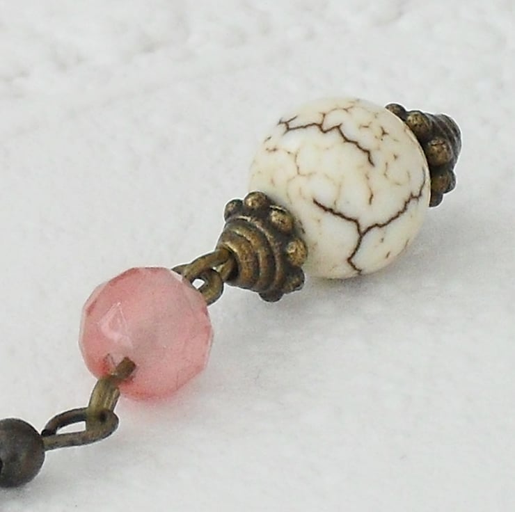 I have added some antique brass beadcaps around the magnesite and hung them on antique brass wires.