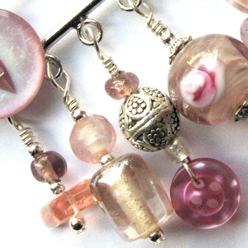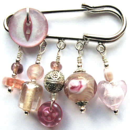 Cute little handmade Rainbow Pin in classy shades of vintage pink. Silver plated pin handwrapped with various luscious beads including a foil lined pink glass heart and a floral glass lampwork bead. There are two sweet little vintage buttons, recycled from clothes I had as a child.These little pins are just so versatile! You can use them to cheer up a plain outfit, fasten a scarf, adorn a bag... Pin measures just over 2" from end to end.Your pin will be lovingly wrapped and carefully packaged to ensure a safe delivery.