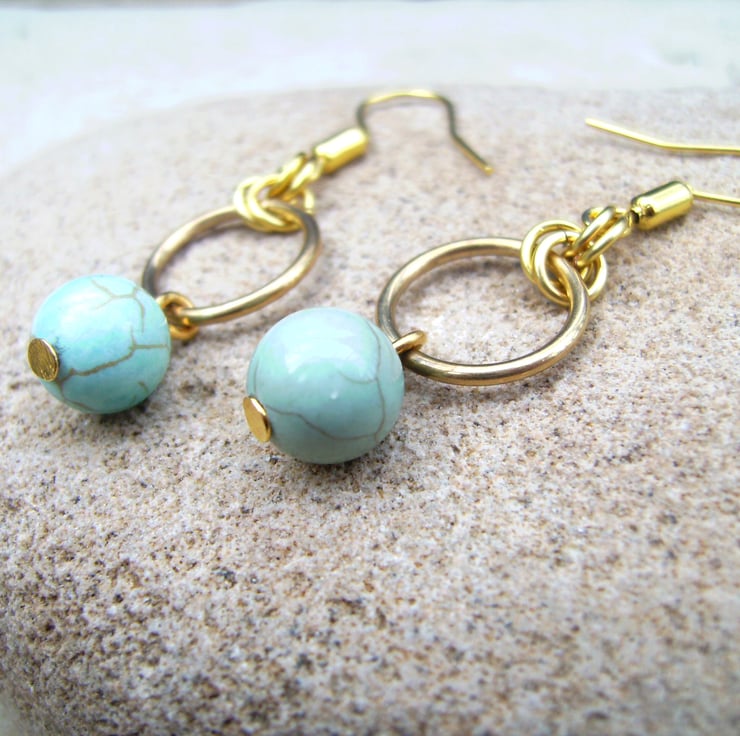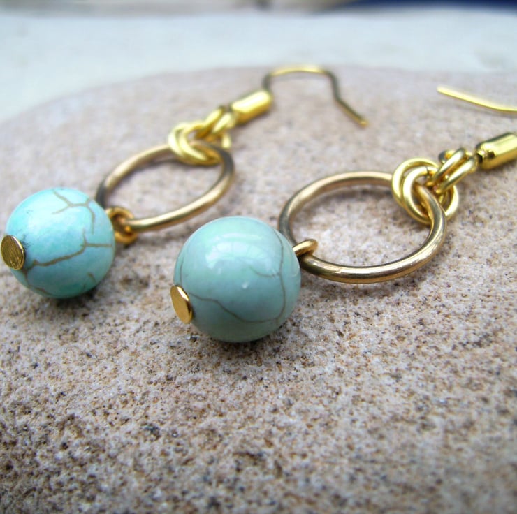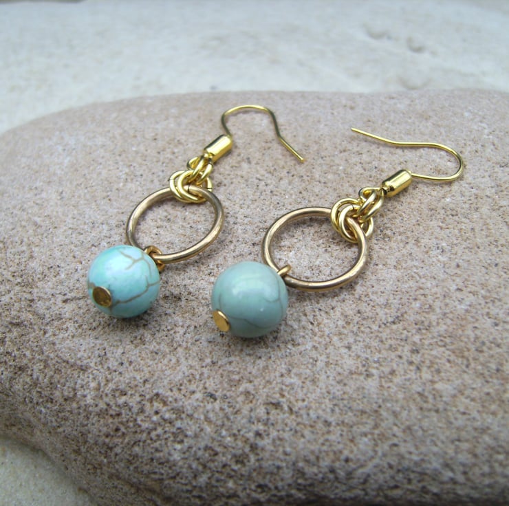 This pair of earrings has been created using 8mm turquoise semiprecious gemstone beads with brass rings & gold colour enamelled copper jump rings, attached with gold plated wire to gold plated ear hooks.