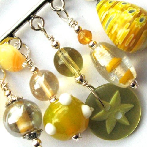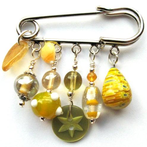 Happy little handmade Rainbow Pin in shades of sunshine yellow. On second thoughts, it's not just happy - it's ecstatic! Just like a big bag of sherbet lemons...Silver plated pin handwrapped with various beads, including lampwork, Czech glass, a millefiori teardrop and a cute button recycled from a baby's cardigan. These little pins are just so versatile! You can use them to cheer up a plain outfit, fasten a scarf, adorn a bag... Pin measures just over 2" from end to end.Your pin will be lovingly wrapped and carefully packaged to ensure a safe delivery.