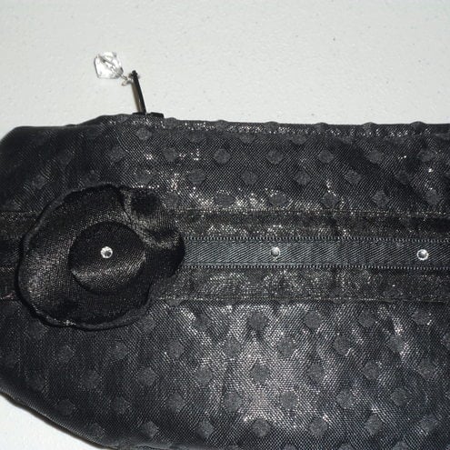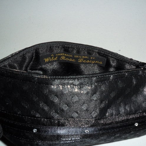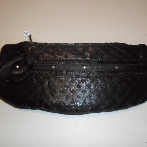 This handbag sized make-up purse is trimmed with a black satin ribbon overlaying a black organza ribbon, dotted with tiny diamantes. It is finished with a handmade rosette centered with a self covered button and diamante. The zip pull has a clear bead attached to it.