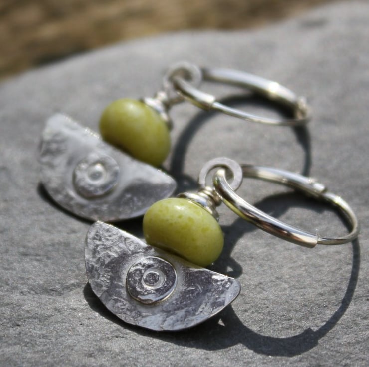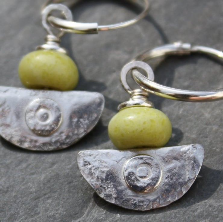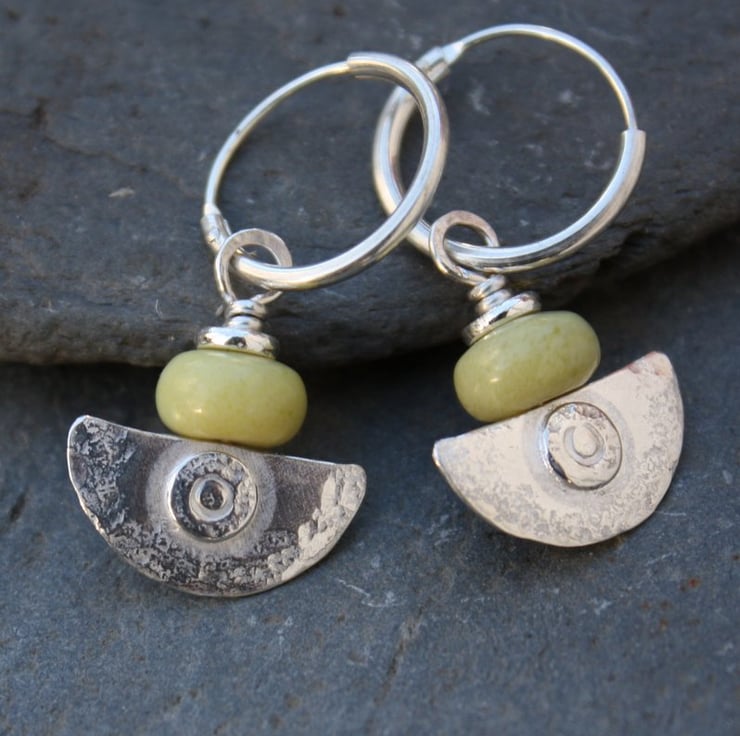 Sterling silver and butter jade earrings. Fused and hammered for texture, then burnished to a subtle shine.