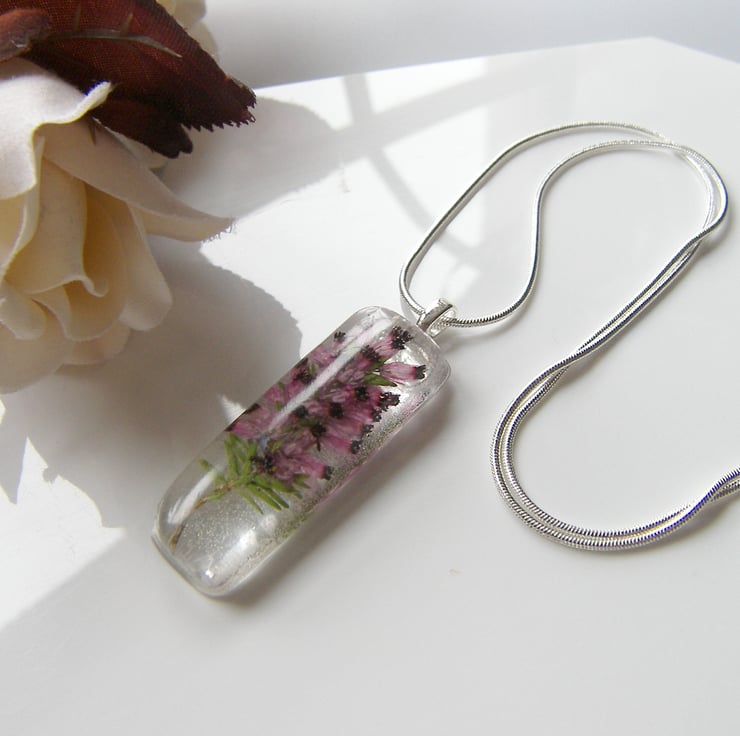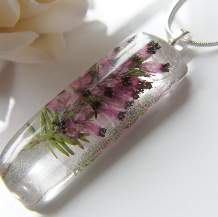 Description: I have very carefully dried and pressed this lovely purple Scottish heather, straight from very own garden:) (treated to retain colour) (colour could vary in purple mauve shades depending on what is available at the time) sealed in UV resistant, non toxic resin. Pendant measures approx 50mm x 15mm, (approx 2 x just over 0.5)) hangs on an 18" silver plated chain. ( Simply stunning!!)