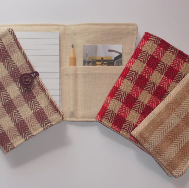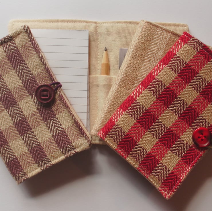 This fabric note pad holder contains a little notebook and pencil and an inside pocket to keep all your business cards safe its just the right size to keep in your handbag and always have to hand when needed.