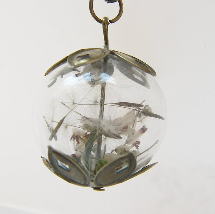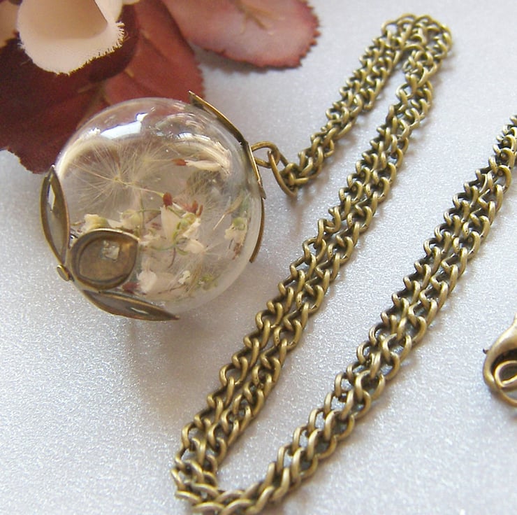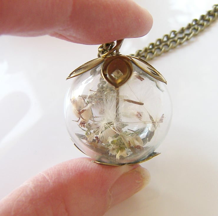Description: I have very carefully filled this large Beautiful hand blown lar glass hollow bead measures approx 20mm) with lucky white heather and dandelion seeds then attached vintage style filigree caps to top and bottom, hangs from a long 22" antique bronze plated chain, if you prefer longer or shorter chain message me to let me know. (lovely necklace, such a pretty reminder of childhood innocence and a must have for any nature lover:)