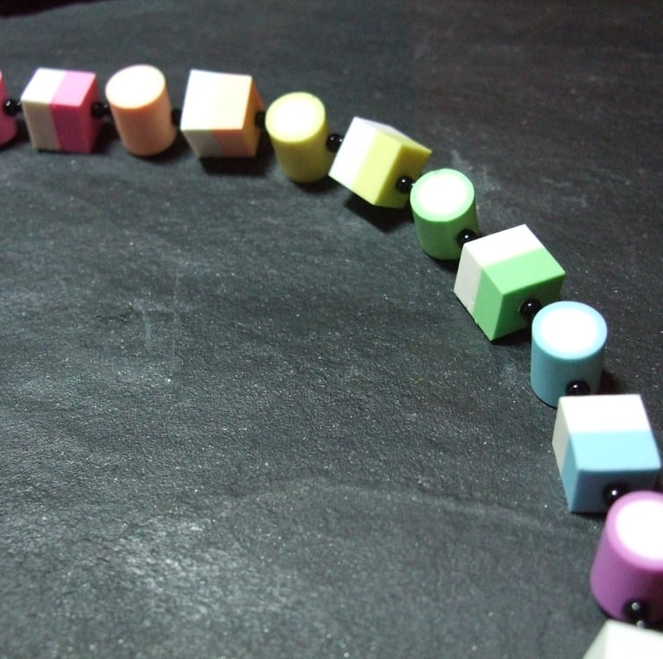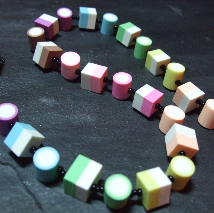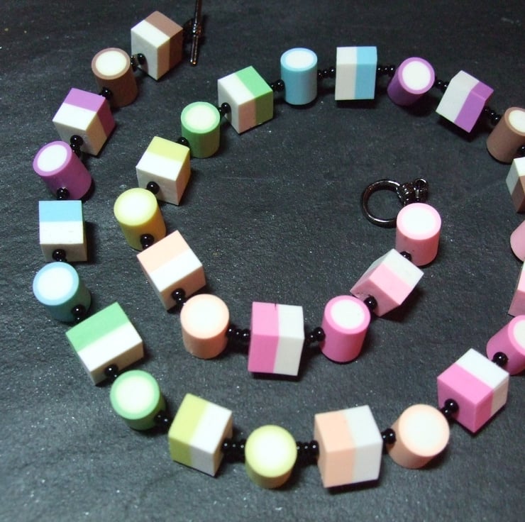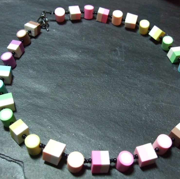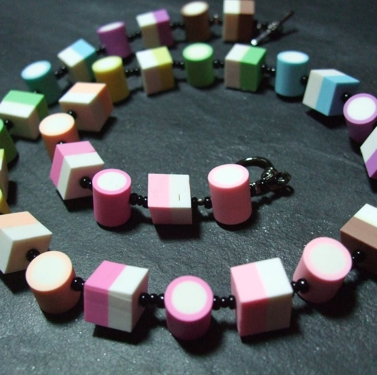 A cute, whimsical necklace from the Kitsch Creations New Dolly Mixture Collection, this item is lovingly constructed using a selection of extremely high quality individually hand crafted licquorice allsort polymer clay canes sourced from a UK designer off-set to dramatic effect with the simplest black seed beads and high quality black metal jewelry findings.