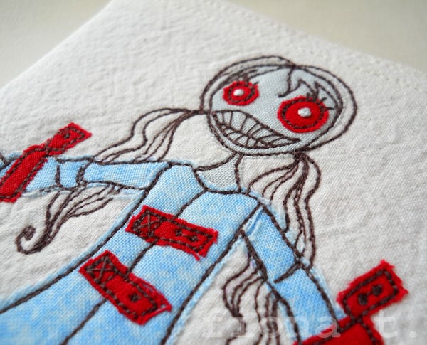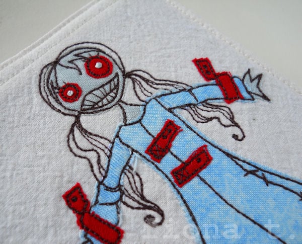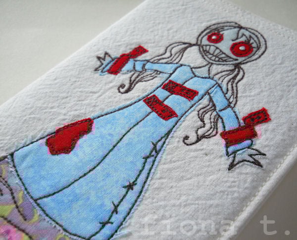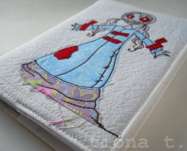 straight jacketed zombie lady embroidered fabric notebook cover & A6 notebook.