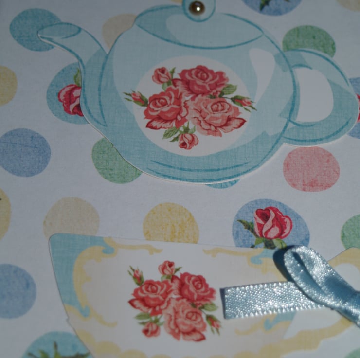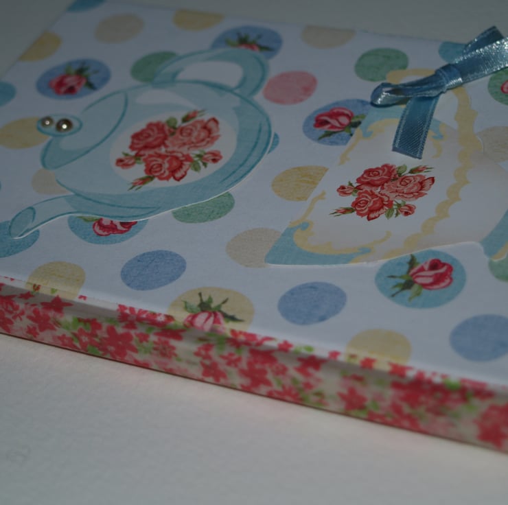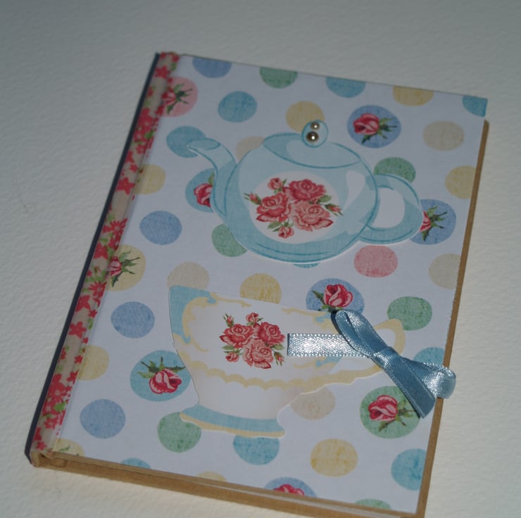 This is a hand inked and hand decorated notebook, with white, lined pages. The notebook has patterned paper on front and back, and a floral spine. The front has been decorated with a teapot and teacup, finished with faux pearls and a bow.
