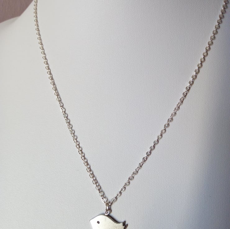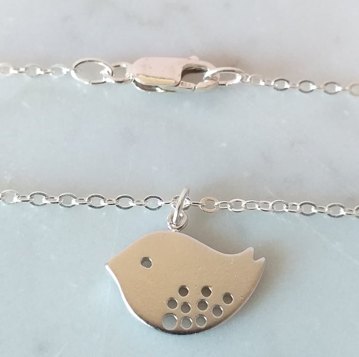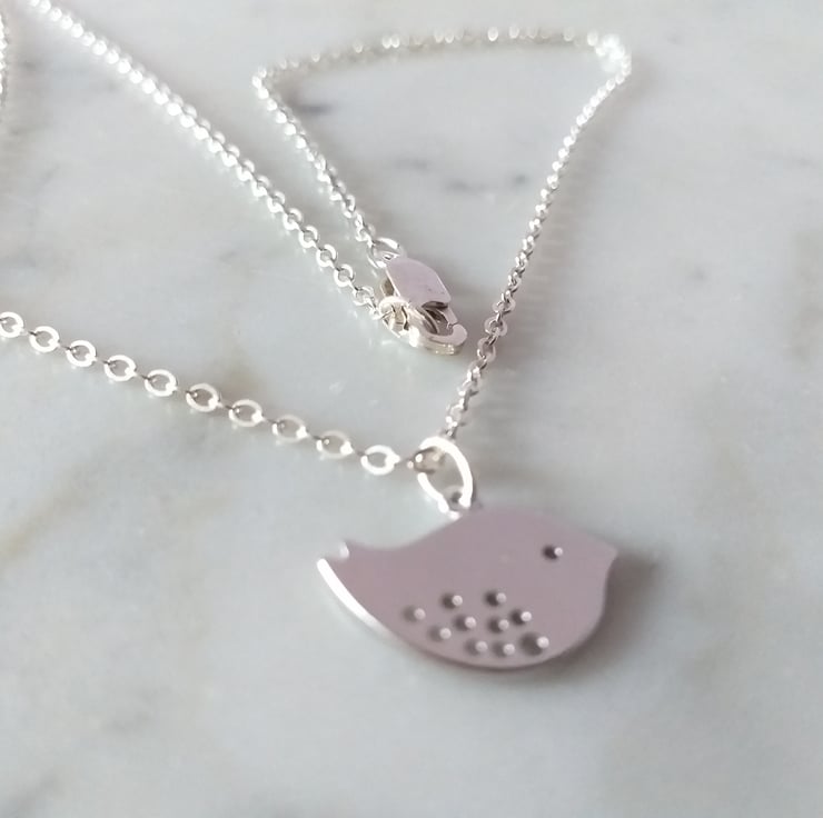 HANGS FROM A FLAT LINK STERLING SILVER CHAIN WITH A STERLING SILVER 925 STAMPED LOBSTER CLASP.