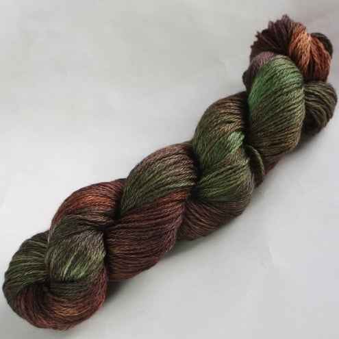 Woody browns, rust, olive green and a little emerald. This soft and silky smooth yarn should make wonderful socks, or other projects requiring sock-weight yarn. The yarn has been reskeined as shown in the first two photographs, but is shown in the third photo before reskeining, for reference only.