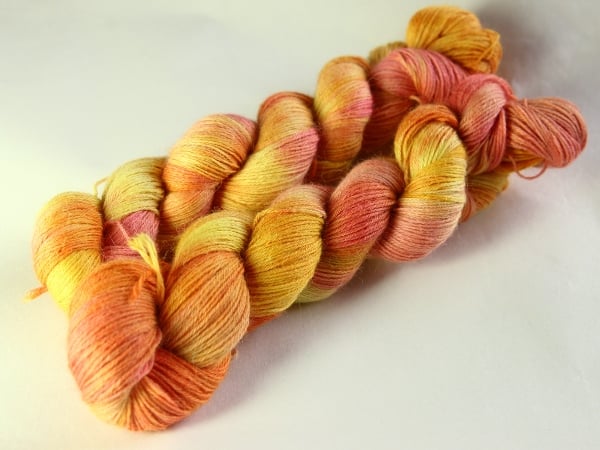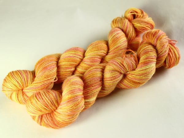 Soft shades of lemon, yellow-orange and peachy-pink. This is a lovely, soft sock/4-ply/fingering weight baby alpaca yarn. Yarn has been reskeined as shown in the first two photos but is shown before reskeining in the third photo for reference. There is one skein left.