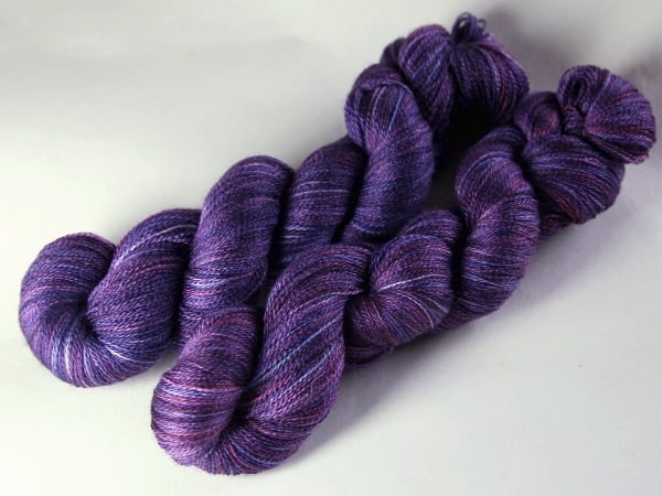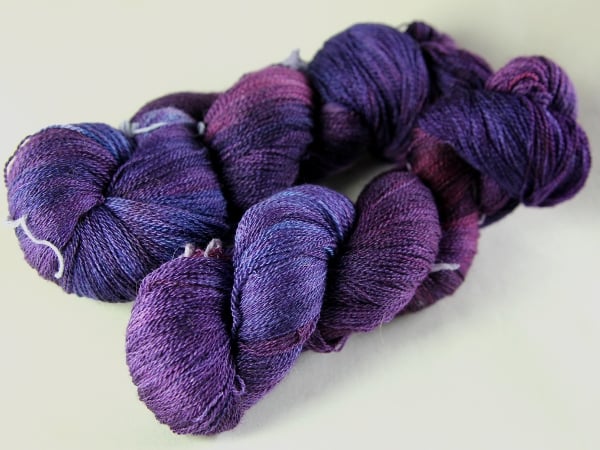 Shades of deep purple and violet with some lighter blue and lilac sections. This luxurious two-ply laceweight superwash merino and silk blend has a smooth, silky feel and a lovely sheen. It should make beautiful lace projects. There are two skeins available (price shown is for one). They have been dyed together, but as ever there are differences in blending so if you plan to use both skeins in the same project, alternating skeins as you work is recommended.