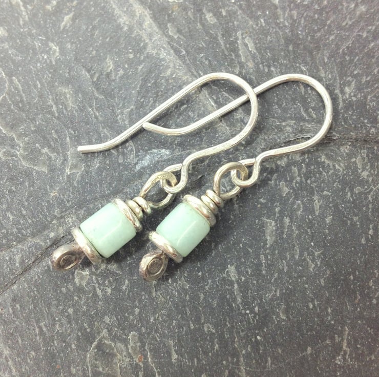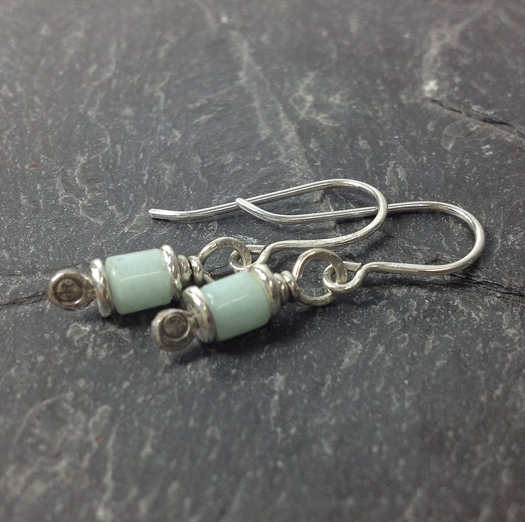 Forged sterling silver pins have been threaded through 5mm silver washer beads and pale aqua amazonite heishi.