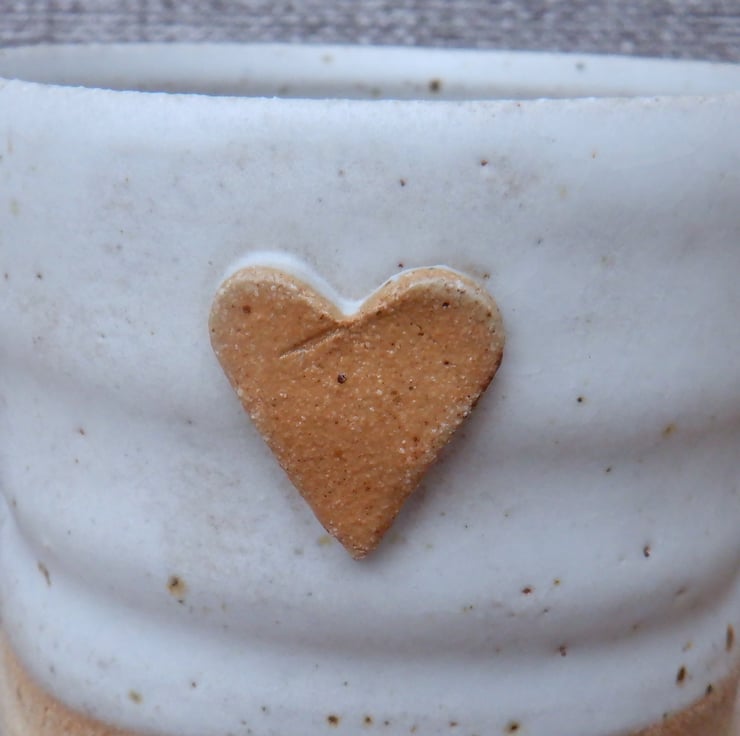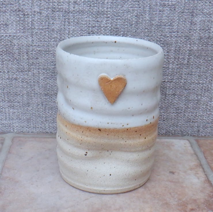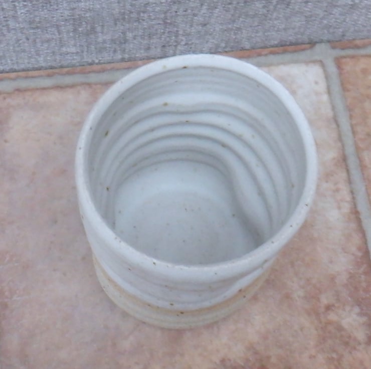 This large beaker was wheelthrown by me using strong off-white stoneware clay, with a distinct speckle, and finished it in a lovely satin ivory cream glaze.
