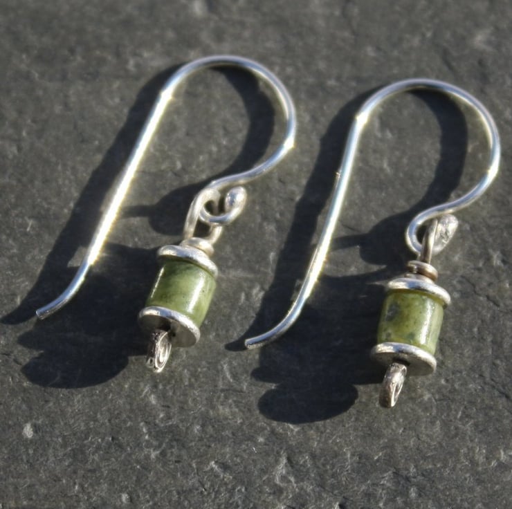 Forged sterling silver pins have been threaded through 5mm silver washer beads and muted green Nephrite jade heishi.