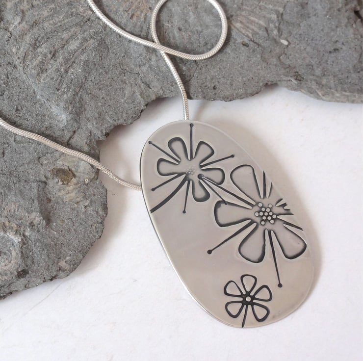 Lovely large flat oval shaped pendant hand made in sterling silver hung from a sterling silver 16 inch snake chain.