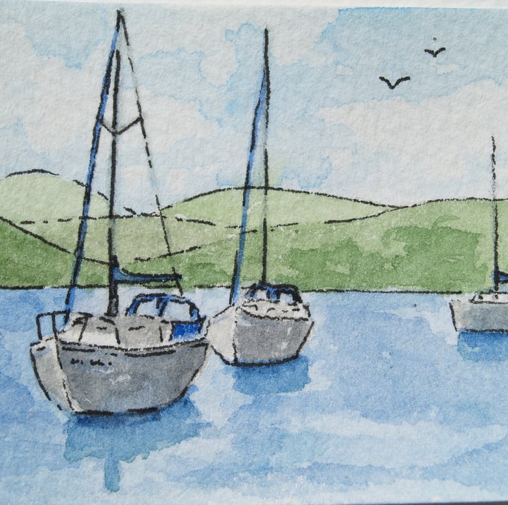 Sailing on Windermere in the Summer, I was inspired to paint the boats around us. This view is looking up the lake towards the Langdale Pikes.