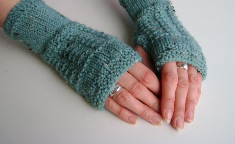 These duck egg blue soft fingerless mittens / wrist warmers / gloves are knitted with a pretty waffle pattern. They are made from 25% Aran tweed wool and are 8 inches long.