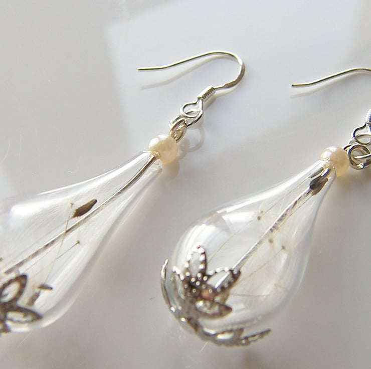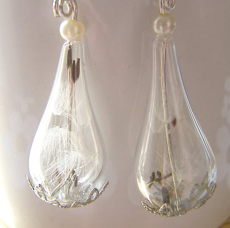 Description: I have very carefully filled these Beautiful hand blown glass hollow teardrop beads with real dandelion seeds, teardrop measures approx 30mm x 15mm) (just over 1" x 0.5") then topped with tiny ivory faux pearls these hang from 925 sterling silver earwires ( so pretty, delicate, whimsical and dreamy, a beautiful reminder of childhood innocence and perfect for any nature lover