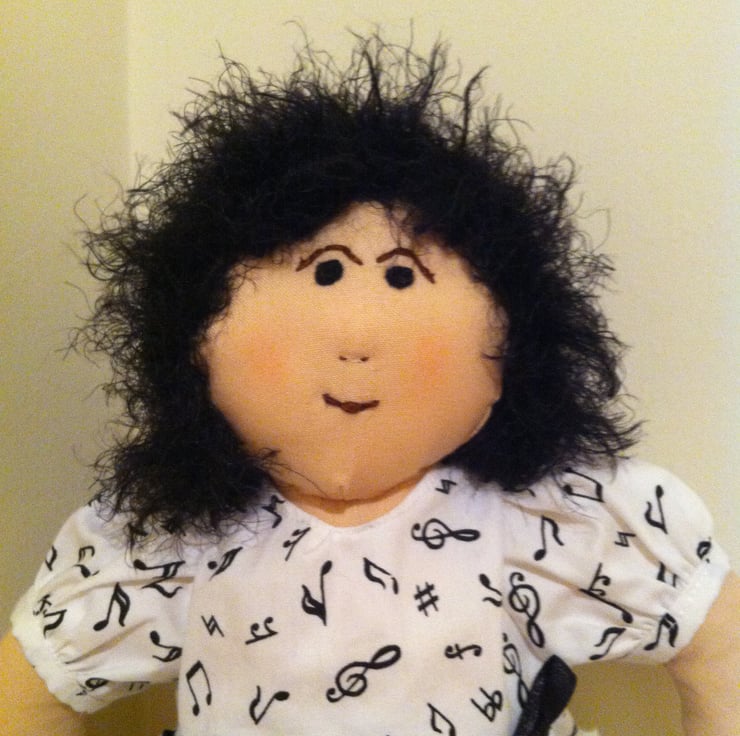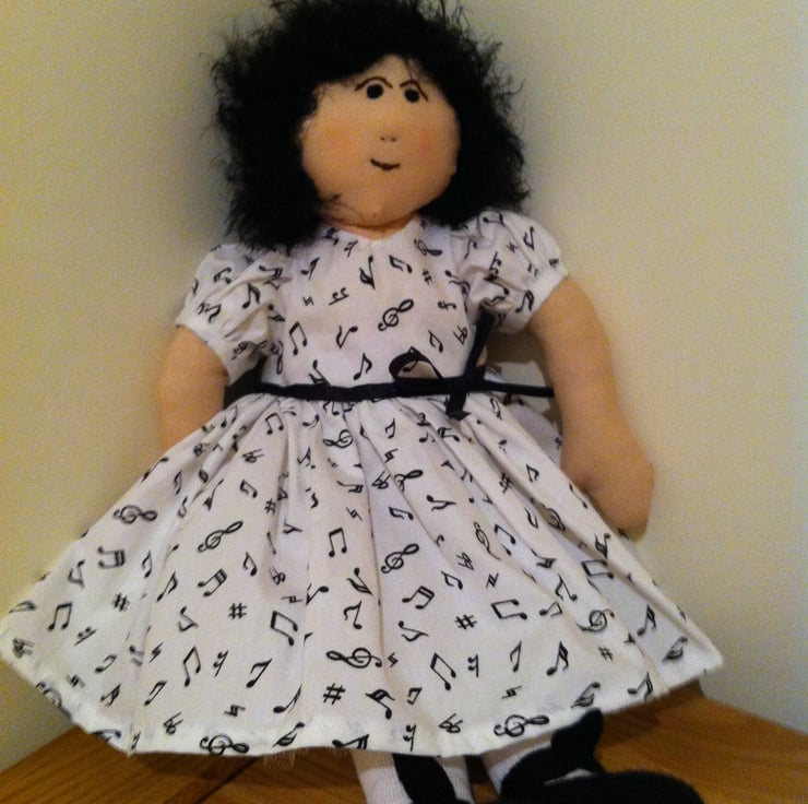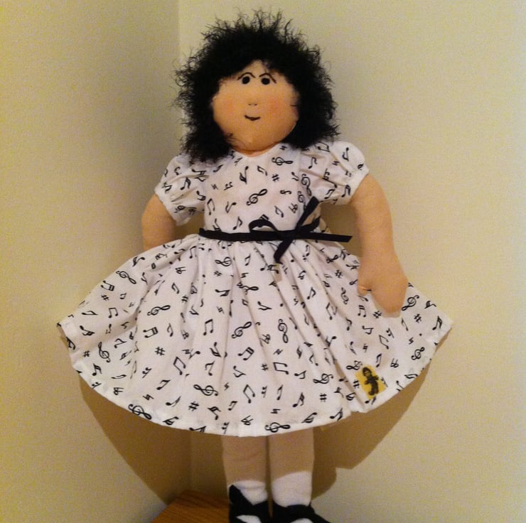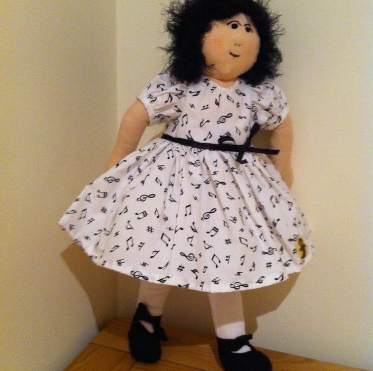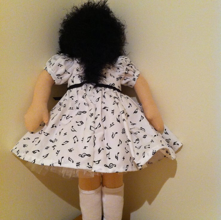 Nina is ready for her music lesson in her white puff sleeved dress covered in little musical notes and drimmed at the waist with a black bow. The dress has a net underskirt and Nina has white socks and pants and soft black shoes to match. Nina's soft black hair is long at the back and her little face has a very determined look. A lovely gift for a little girl. Nina comes in a matching organza tote bag decorated with her name and is unsuitable for children under 3 years of age because of small decorations.