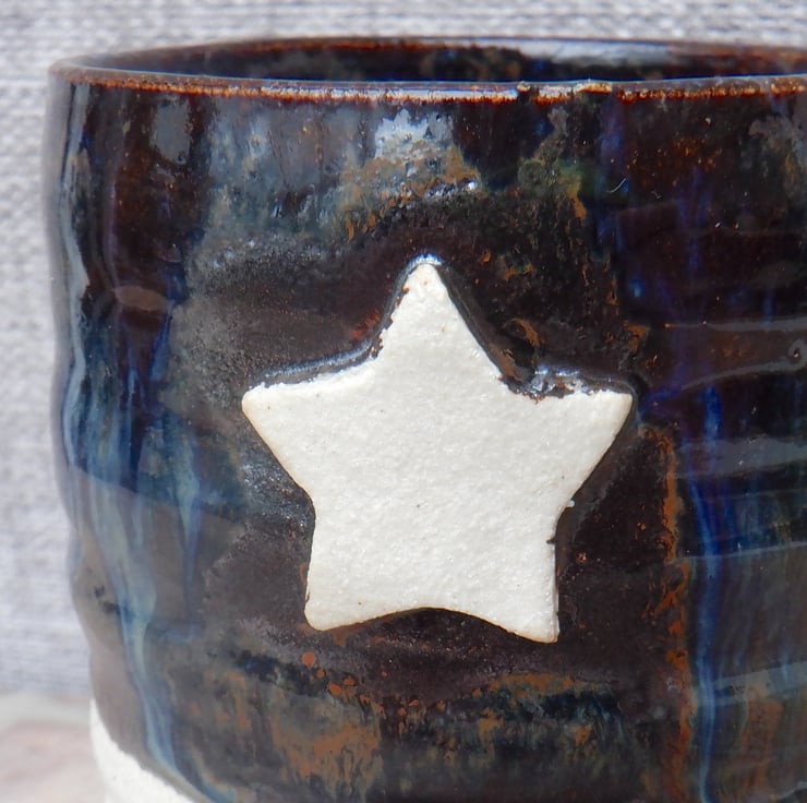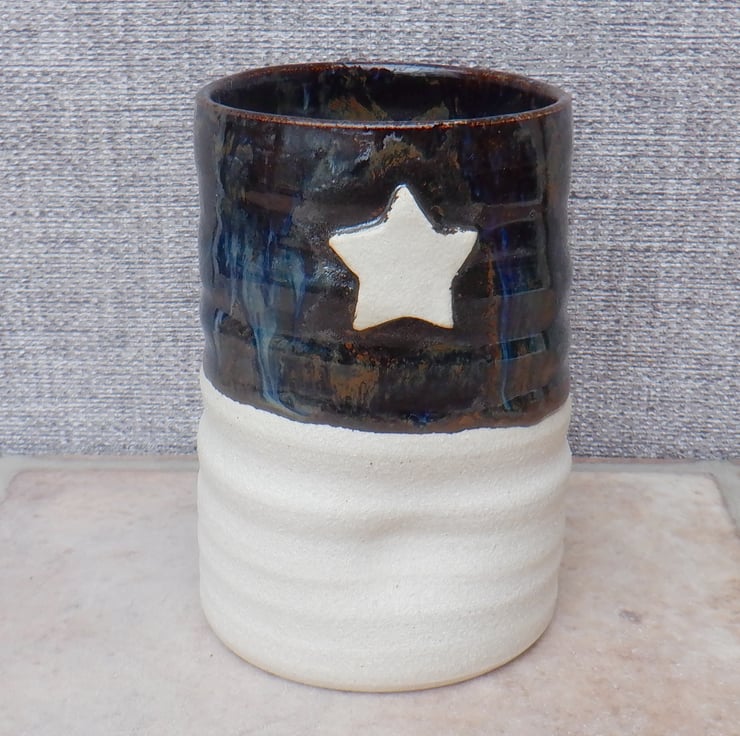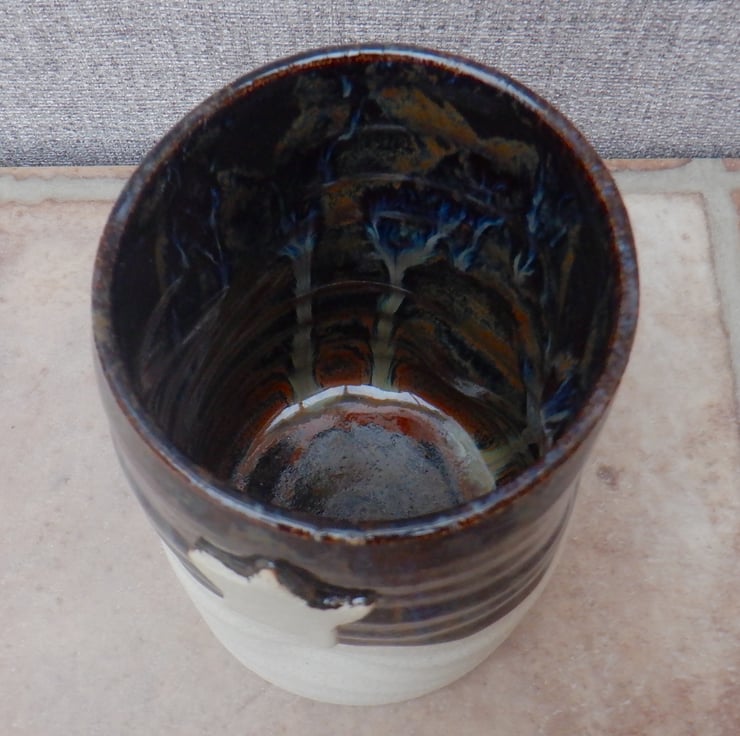 This beaker was wheelthrown by me using strong off-white stoneware clay, and finished in a lovely combination of chocolate brown, black and runny blue reactive glazes.