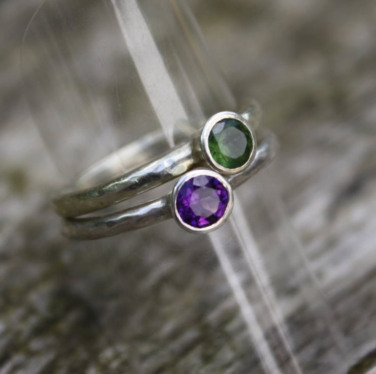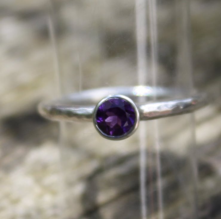 It is handmade from sterling silver and has a 4 mm faceted amethyst in a rub over setting.