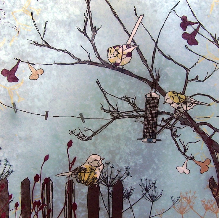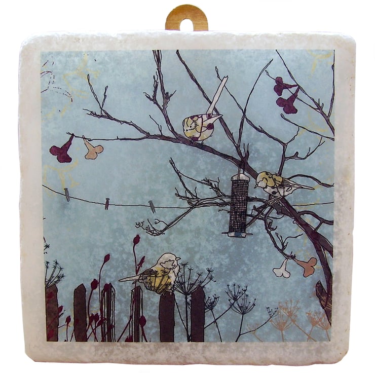 This tile features my original artwork, inspired by my magical allotment and it's various flora and fauna. The design is created through a combination of hand drawn imagery, drawing directly on the computer screen and taking patterns and shapes from my own digital photographs. These elements are then layered and positioned until i am happy with them to make the finished design you can see on the product. My design is then printed onto a special decal paper which is carefully applied to a white marble tile. I have then glued a small brass mirror plate to the back so you easily hang the tile on the wall (nail not supplied) and applied a couple of coats of varnish for extra protection.