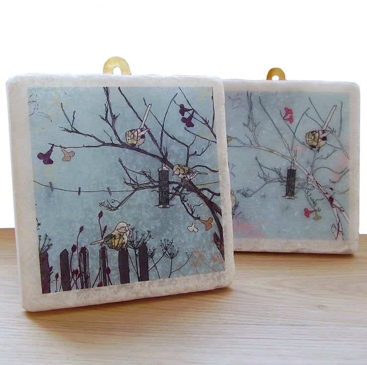 white marble tile featuring an original 'littlebirdy' design to hang on your wall!