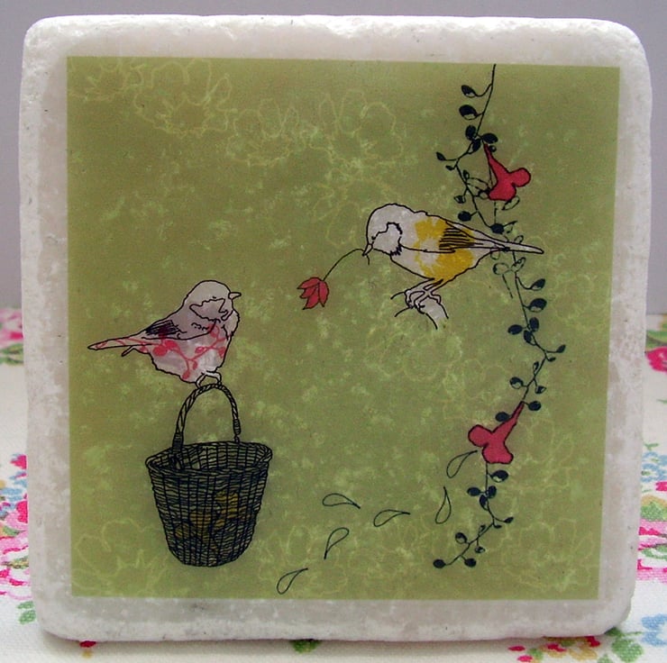 Each tile features my original artwork, inspired by my magical allotment and it's various flora and fauna. The design is created through a combination of hand drawn imagery, drawing directly on the computer screen and taking patterns and shapes from my own digital photographs. These elements are then layered and positioned until i am happy with them to make the finished design you can see on the product. My design is then printed onto a special decal paper which is carefully applied to a white marble tile. Each tile is varnished so can be safely wiped clean without harming the design. Each tile also has foam feet making them scratch resistant and a 'littlebirdy' sticker on the back.