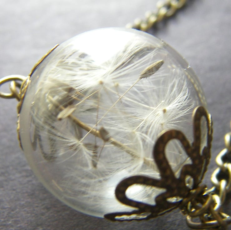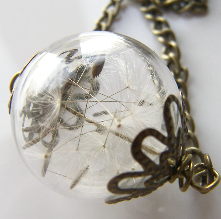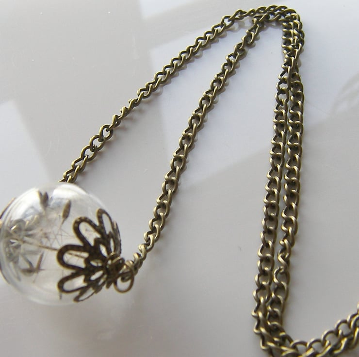 Description: I have very carefully filled this Beautiful hand blown large glass hollow bead measures approx 20mm with dandelion seeds and attached vintage style caps to ends, hangs from an antique bronze plated 20" chain, if you prefer longer/shorter chain just ask.. (such a lovely reminder of childhood innocence and a must have for any nature lover:)