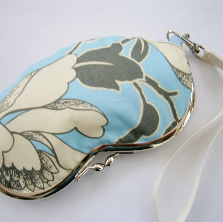 Charming little wristlet purse for sunglasses or mobile phone in pretty Amy Butler Blue Tree Peony fabric with contrasting lining and removable spotty or plain wrist strap.