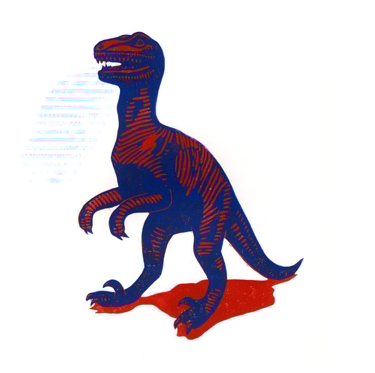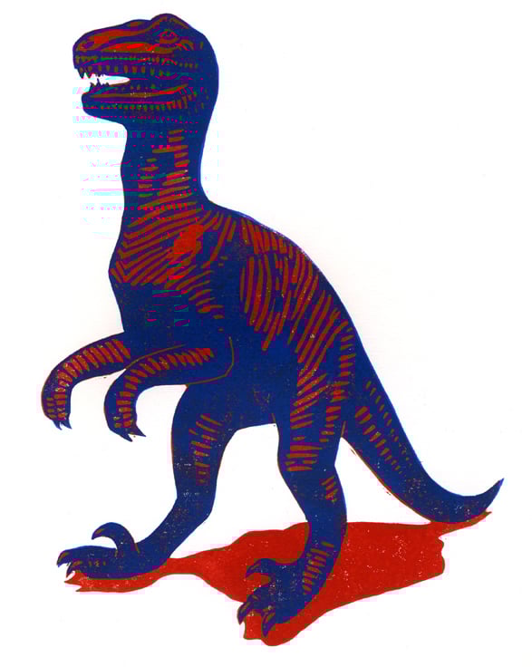 A hand-printed linocut print entitled 'Deinonychus!'.